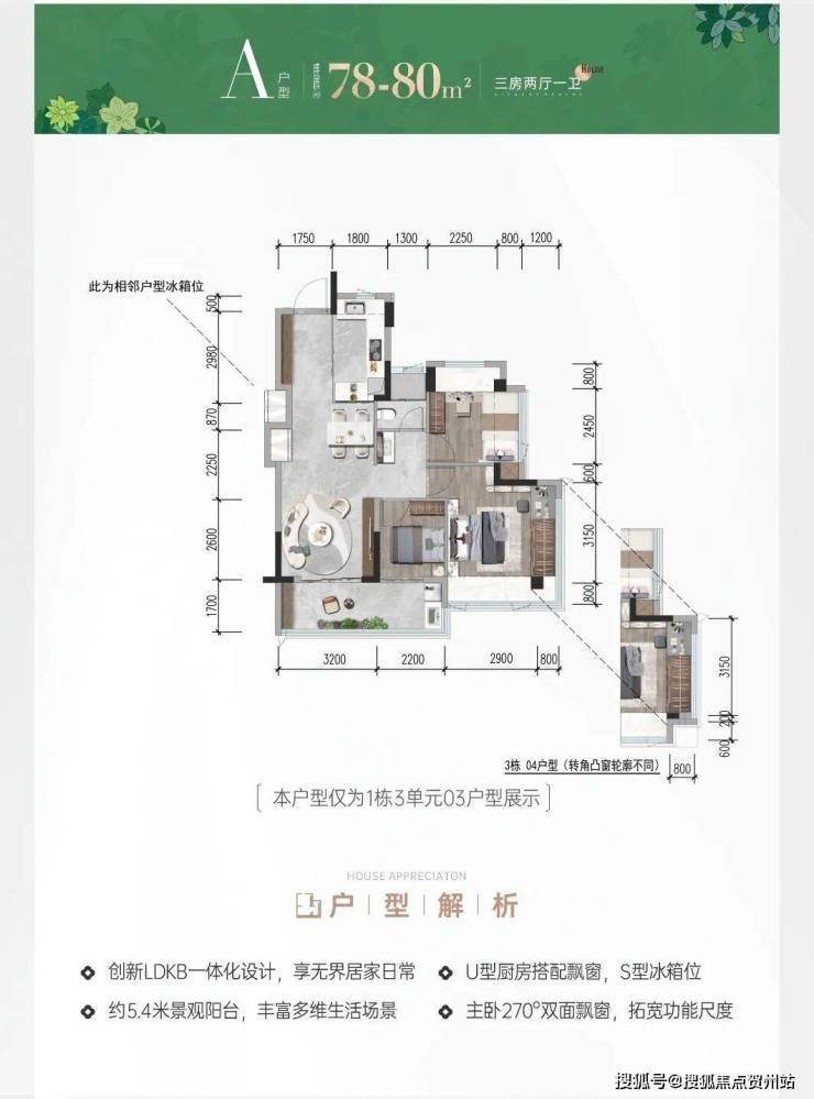 78㎡3房1卫:总价340-390万/套,单价4.3-5万/㎡
