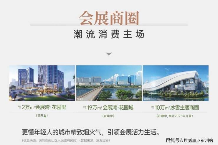<商业>:距离约2公里的会展湾·公园里(建面约2万㎡)已开业,引入麦当劳、瑞幸、潮汕特色餐饮等品牌;约5公里处的万丰海岸城16万方商业综合体、鸿荣源湾区壹方及宝安首家山姆会员商店等成熟商业体。