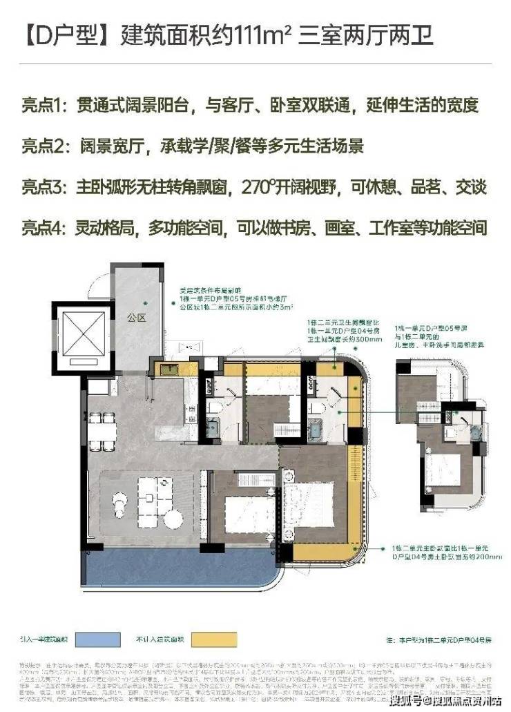 建面约 111㎡ 宽厅阔景 灵动三房:宽厅设计带来开阔视野,空间灵动多变,可根据家庭需求灵活调整,兼顾实用性与舒适性;