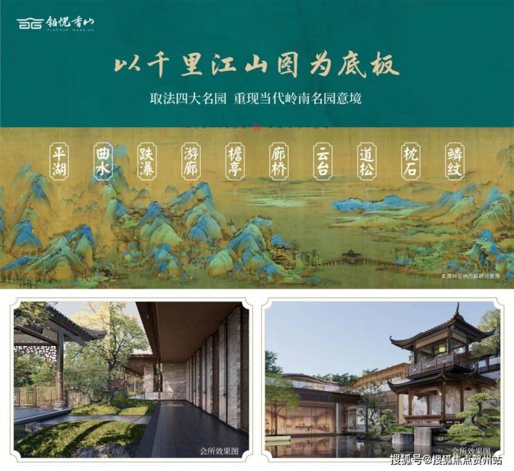 园林设计以 《千里江山图》为灵感蓝本, 巧妙融合岭南四大名园精髓,复刻佛山梁园"半边亭"。通过"漫卷云章"、"金水澜庭"、"琉璃水院"三进式景观轴线,呈现移步换景的东方美学。