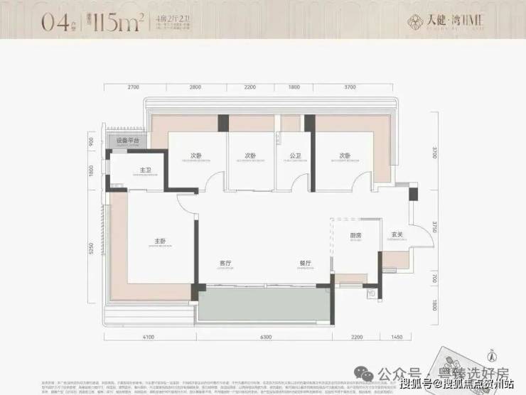 115㎡4房2卫,横厅户型,朝南看海,入户独立玄关,但三个次卧朝北;