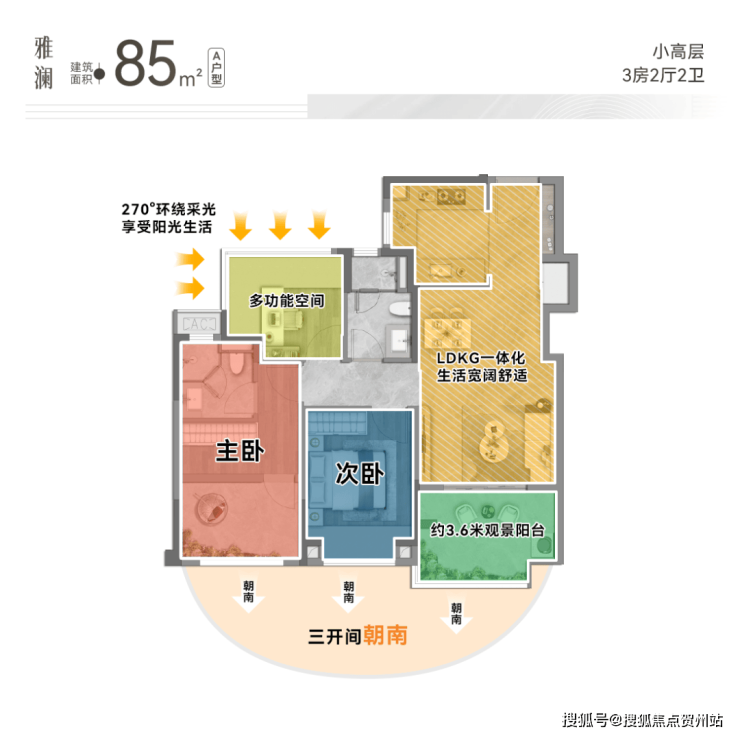 南北通透、三开间朝南的布局+约3.6米的无界视野阳台,充分拥抱阳光,为室内带来充足的自然光照。