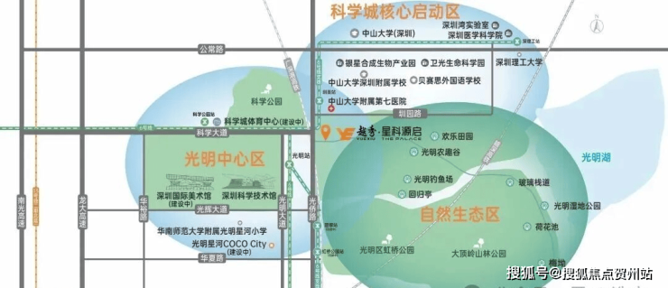 越秀星汇珑府,位于光明区新湖街道光侨路与科学大道交汇处东南侧,地处光明中心区板块,西北侧与科学公园北翼相邻,东南侧则是充满欢乐的光明欢乐田园,北侧靠近中山大学深圳校区及其附属第七医院,南面距离光明高铁站仅4.8公里。