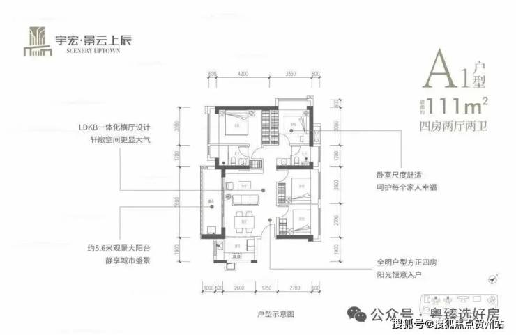 111m² 四房折后单价4.16-5.13万,总价464万~572万