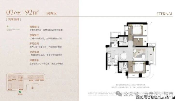 92m²的3房2厅2卫,设计的是双龙抱珠格局,客厅3.2米开间,LDKB一体化宽厅,主卧套房270°环幕凸窗,七大凸窗+设备平台,分别做到了主卧16.06㎡/次卧12.82㎡/次卧6㎡(实测面积,去掉墙体),U型厨房,卫生间干湿分离,得房率超90%(包含赠送),阳台实测6.54㎡正东朝向。