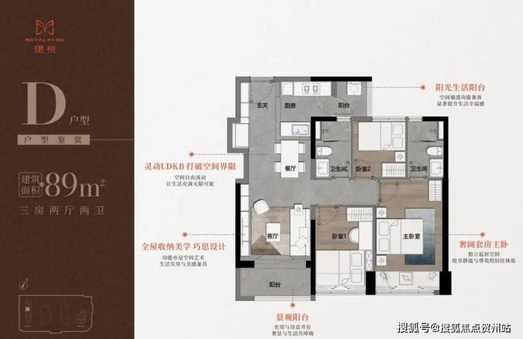 (1)89㎡三房:包含A/B/C三种户型,采用竖厅或横厅布局,三开间朝南,U型厨房与三段式公卫提升实用性。部分户型配备5.6米观景阳台,主卧双飘窗设计增加采光。