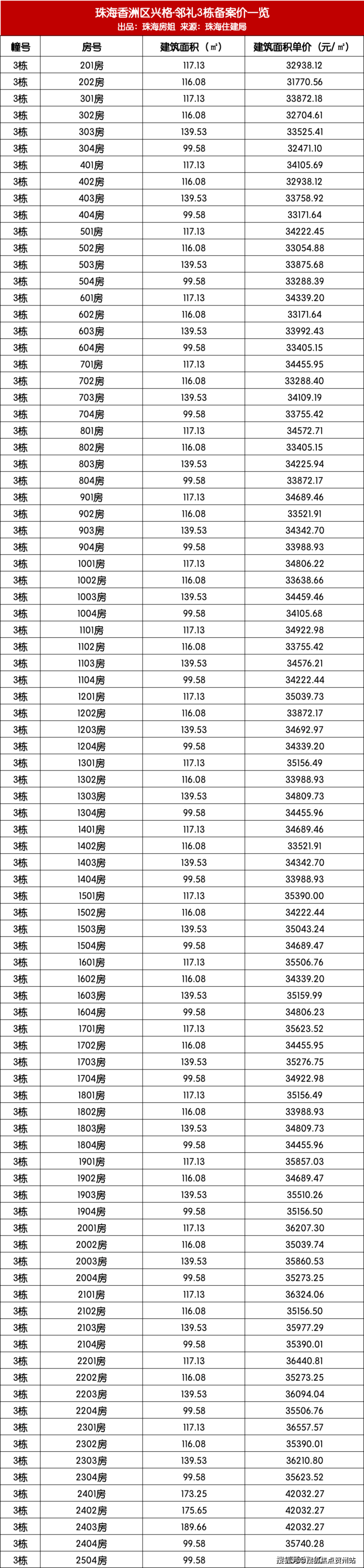据珠海住建局显示,位于前山的兴格·邻礼首次公布3栋新品备案价,共计91套房源,产品为建面约99-139㎡单位。