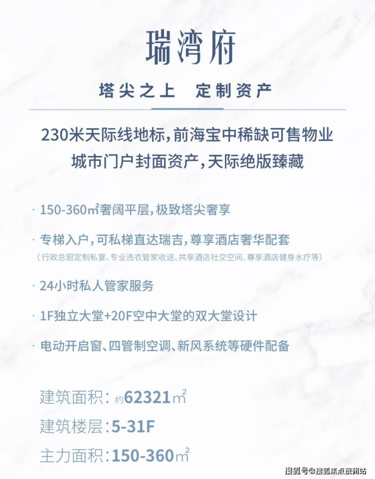 项目33-50F为瑞吉酒店,5-31F瑞湾府目前在售190-360㎡酒店式行政公馆,层高4.4米。