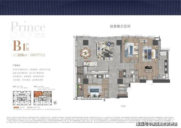大尺度空间 纵享环幕视野大平面大尺度定位,层高约3.6米,横厅设计确保最大化观景面全户型纵享环幕视野。项目打造主力建面约215-415㎡纯粹品质公寓共191席,顶层为建面约1270㎡公寓产品。