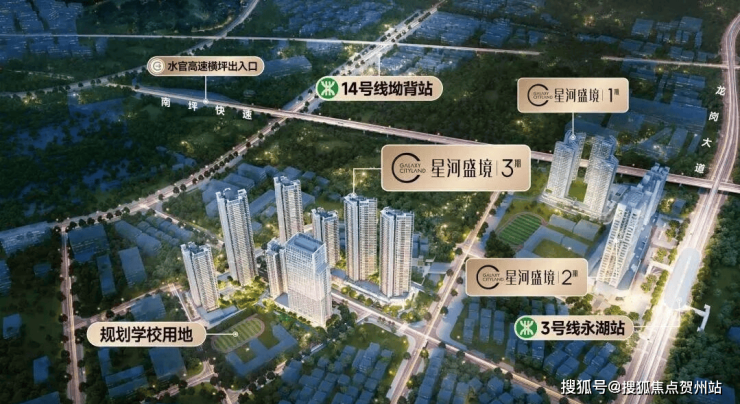 星河盛境3期,位于深圳市龙岗区园山街道,地处大运板块核心区域,毗邻地铁3号线永湖站及14号线坳背站,是双地铁覆盖的TOD综合体项目。项目周边交通网络发达,14号线可1站直达大运枢纽,5站至罗湖、6站至福田,规划中的21号线和33号线将进一步强化与坂田、南山及机场东的快速连接,形成覆盖全城的“五纵四横”路网结构(水官高速、龙岗大道等),便捷通达深圳核心区域。