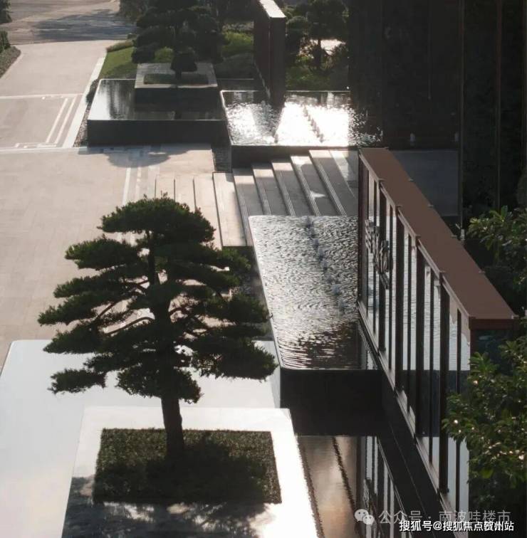 归家大门两侧以“百万级迎客松”为点缀,中间采用“泗水归堂”设计,搭配九阶石台阶、水景、多重檐口,气派奢华,岭南美学感扑面而来。