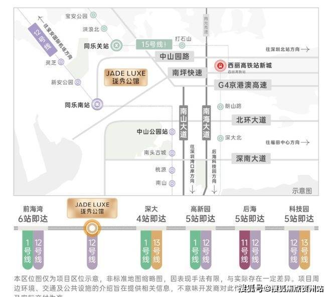 项目拥有“3地铁+3枢纽+2纵4横路网”的多维立体交通体系,通勤效率与出行便捷度兼具。已运营的地铁12号线同乐南站距离项目仅约500米,步行6-8分钟即可抵达,乘坐该线路4站约12分钟可达科技园核心区,5站约15分钟覆盖高新园,无缝衔接南山科创核心板块。在建的地铁15号线同乐关站距离项目约1.2公里,预计2028年12月开通,作为深圳“一环线”,未来将串联宝中、前海、深圳湾、西丽等核心区域,进一步拓宽出行辐射范围;规划中的24号线开通后,4站可直达高新园,强化与科技产业带的紧密连接。枢纽方面,项目距离在建的西丽高铁站约2.3公里,预计2028年建成通车后,1小时可抵达广州、东莞等大湾区城市;临近宝安国际机场(约15公里)和深圳湾口岸(约10公里),满足商务出行与跨境需求。路网规划上,依托“2纵4横”交通动脉,2纵即中山园路链接南山大道、南海大道,4横包括京港澳高速、南坪快速、北环大道、深南大道,自驾15分钟可覆盖福田中心区、宝安中心区等区域,至科技园约12分钟,前海约18分钟,留仙洞总部基地约10分钟,高效衔接城市各大核心板块。