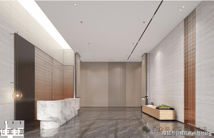 - 约5.1m挑高独立大堂,高端天然石材砌就