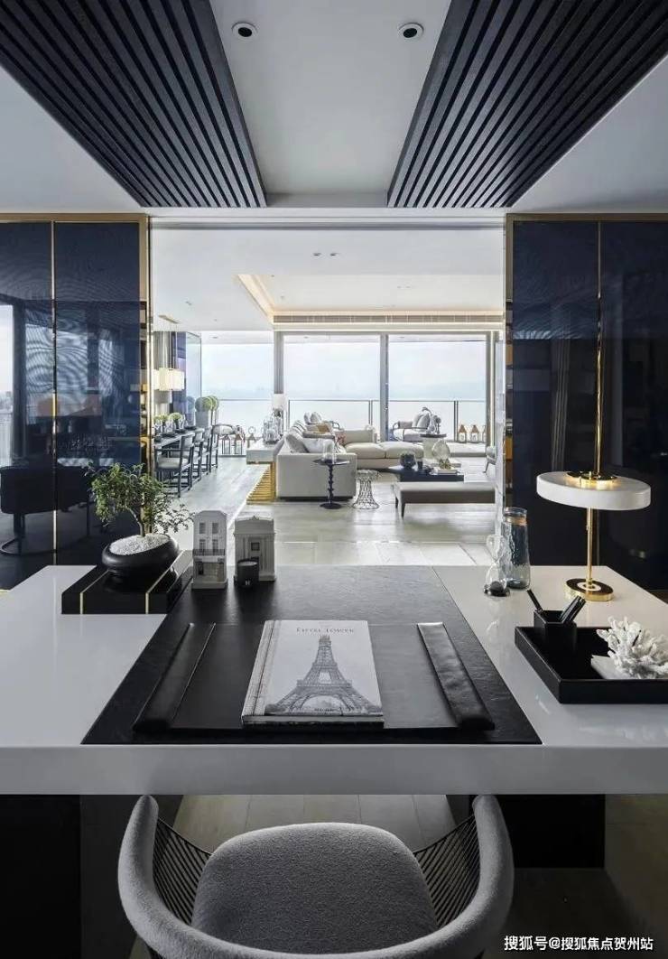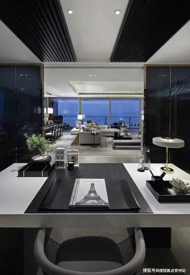 书房位于客厅后侧,深蓝色的玻璃挡板令视线正对眼前客厅,无形中作了区域联动。