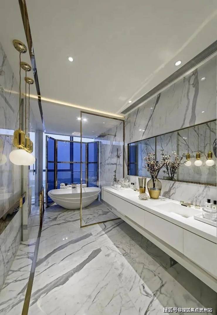 浴室主要铺设理石材质,细腻的纹理粗细不一,向四面八方流淌,一定程度上象征着水的自由。