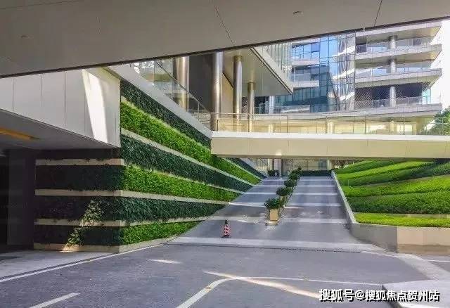 高层区地下车库入口景观,坡道空间通过设置廊架及绿化围合,形成富有层次、绿化掩映的地下车库入口景观。