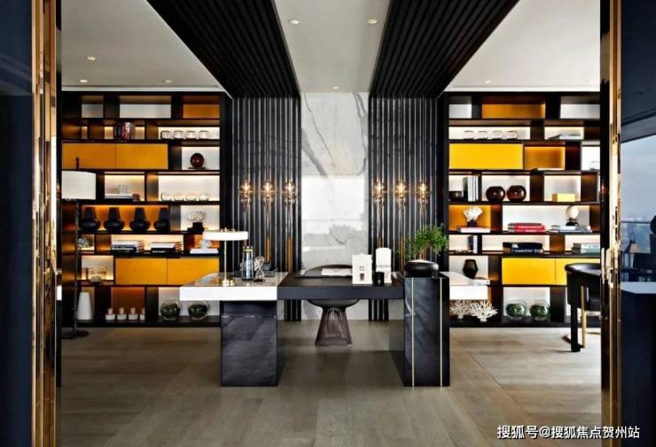 与此同时,室内大幅度运用黑色材质,并打造一墙收纳柜,各式样的藏品和略显庄重的台灯,在金黄色的背景下愈显深沉,美感的交互、共融,在沉静与绚烂间自由转换,也为空间创造出复杂的人文艺术情感