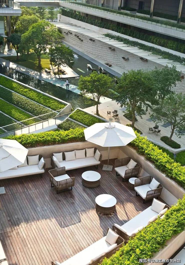 围合式庭院布局最大化构建着生态园林,采用密集的多层次花园种植,营造谧安静的休闲空间,辅以地形和水景的设计营造充满艺术感的休息环境。