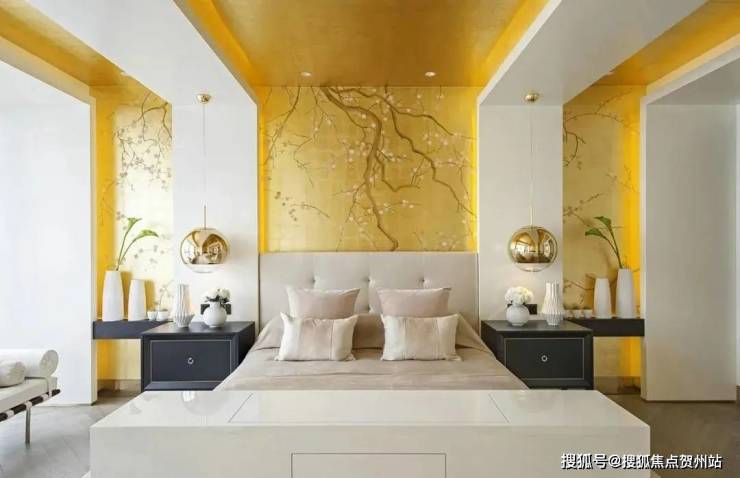 其中一间卧室中,金色在天花板和墙壁间顺畅蔓延,日光般的色彩余调在床前徐徐流转,中式的花枝肌理恰到好处的攀上墙壁,白色、金色的星点之花仿佛具有灵魂般绚烂盛开,阳光与生长形成恰到好处的因果联系,高贵的美学气质再增一层雅致。