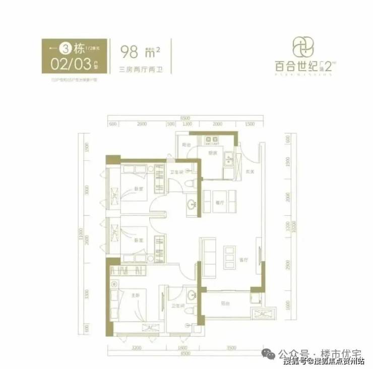 98㎡的3房2厅2卫,3栋02/03户型,设计的是竖厅格局,进门入户玄关客厅3.5米开间,LDKB一体化设计,三开间朝南,动静分区,得房率约76%(不含赠送),正南朝向。套内面积74.48㎡+赠送9.05㎡=实得83.53㎡,加上赠送得房率约85.23%。