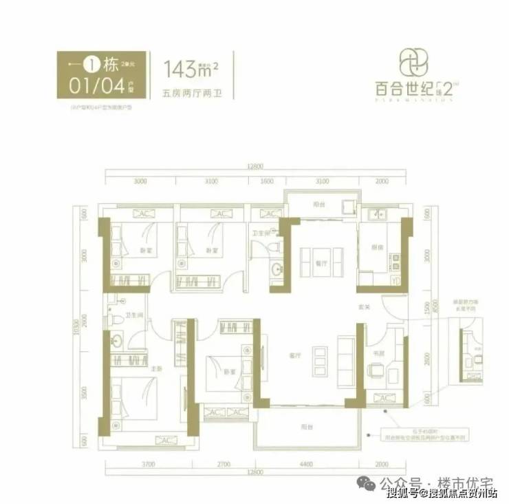 143㎡的5房2厅2卫,3栋1单元04/3栋2单元01户型,设计的是竖厅南北通透格局,进门入户玄关,客厅4.4米开间,客餐厅分离设计,南北双阳台,得房率约76%(不含赠送),阳台主朝西南或东南向。套内面积108.68㎡+赠送17.22㎡=实得125.9㎡,加上赠送得房率约88.04%。