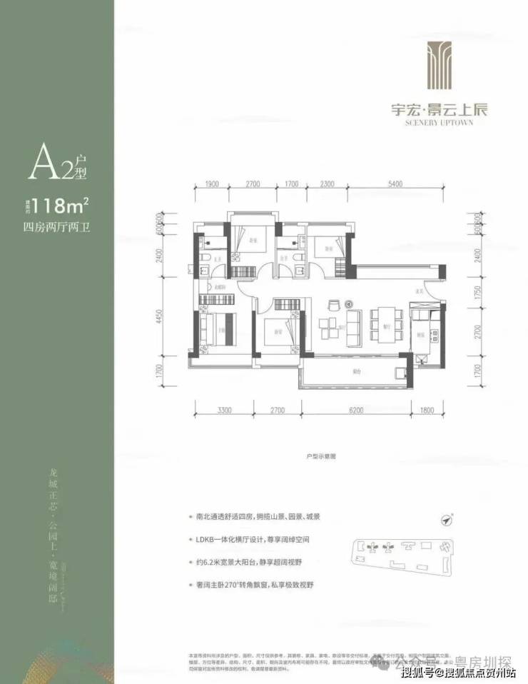 118㎡的4房2厅2卫,设计的是横厅南北通透格局,客餐厅6.2米开间,LDKB一体化,五开间朝南,西北面5.4米长的观景大飘窗,4个卧室分别做到了3.3米/2.7米/2.7米/2.3米的宽度,客厅连接餐厅位出6.2米长的大阳台,L型厨房,卫生间干湿分离,得房率约76%(不含赠送),东南朝向。