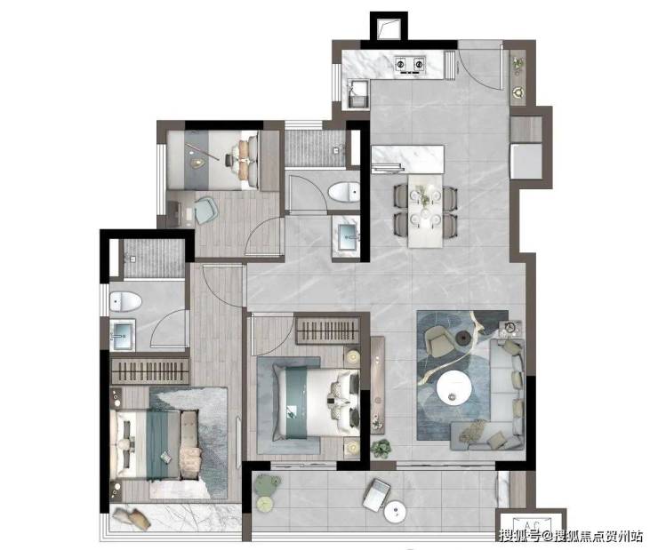 89㎡丨三房两厅两卫; LDKG一体化设计;U型厨房;约6米双面宽超大景观阳台;独立卧室带独立卫浴;主题设计儿童房