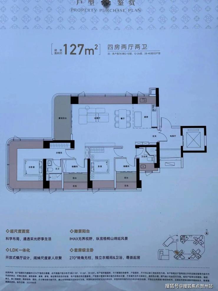 总占地面积约1.58万㎡,总建筑面积约14.1万㎡,计容建筑面积约10.44万㎡,容积率6.54,绿化率40.01%,共由4栋31-45层高住宅组成,4梯5户(低区)/4梯4户(高区)、约125㎡以上专梯专户