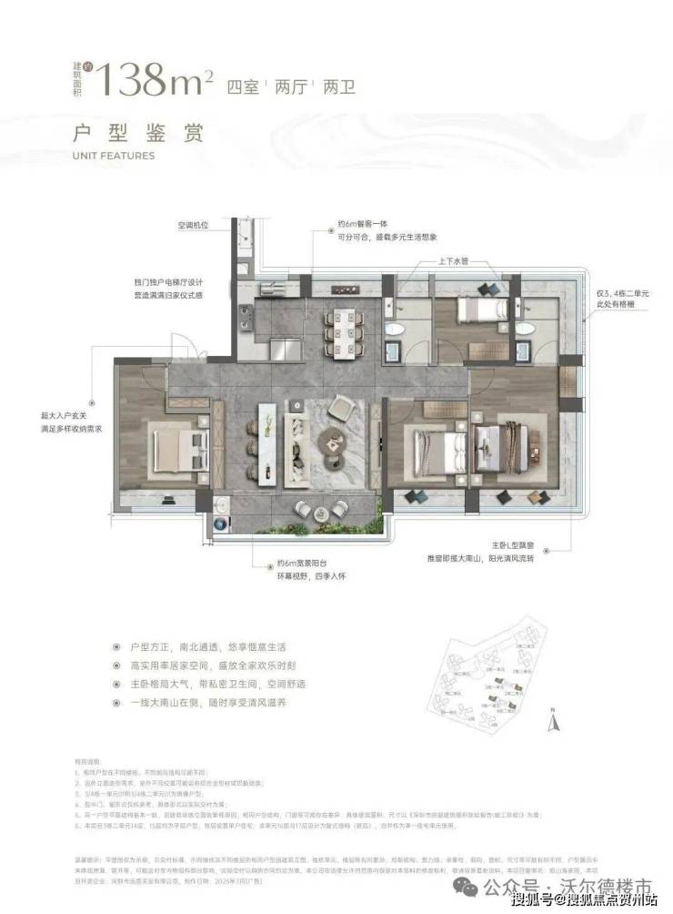 138㎡板楼户型为项目楼王产品,层高约3.05米,横厅设计南北通透,约15.5米南向四开间,采光面宽最大化。LDKB一体化布局,增配多功能厅,主卧带衣帽间、独立卫浴及270°转角巨幕飘窗,超6米跑道级阳台可赏山园双景,得房率高达94%-97%,媲美200㎡+奢宅格局。