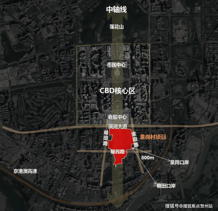 而新皇岗口岸建设也为中轴注入巨大活力,预计2026年启用,将成为全球最大陆路口岸和深港24小时通关枢纽。它将连接5条地铁及城轨,与香港北环线无缝对接,实现快速通关,打造深港同城圈,成为深港超级枢纽。⑥