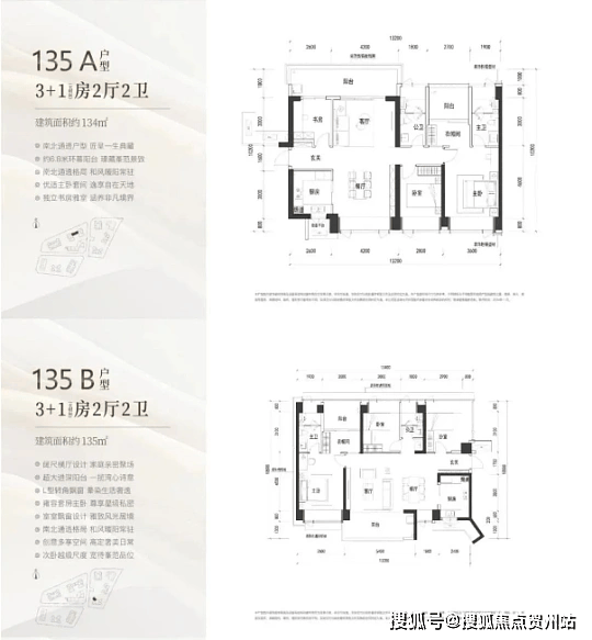 户型特点:105㎡户型为竖厅格局,客厅与卧室连通超大阳台,LDK 一体化设计,主卧室 270 度转角飘窗;120㎡户型客厅与卧室连通 9.6㎡超大阳台,主卧带 5.2㎡衣帽间和观景小阳台;135㎡户型为横厅格局,南北双阳台设计,9.8㎡南向主阳台,主卧带衣帽间和卫生间。