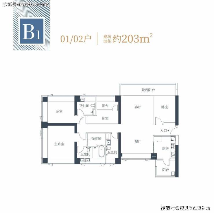 B1户型约203㎡3+1房两卫(1栋2单元01/02户型)竖厅双龙抱珠格局,餐客一体,阳台连通次卧,同时满足生活和观景两个功能;需要靠封阳台获取+1房,阳台东北朝向,距离大南山公园很近,视野景观不错