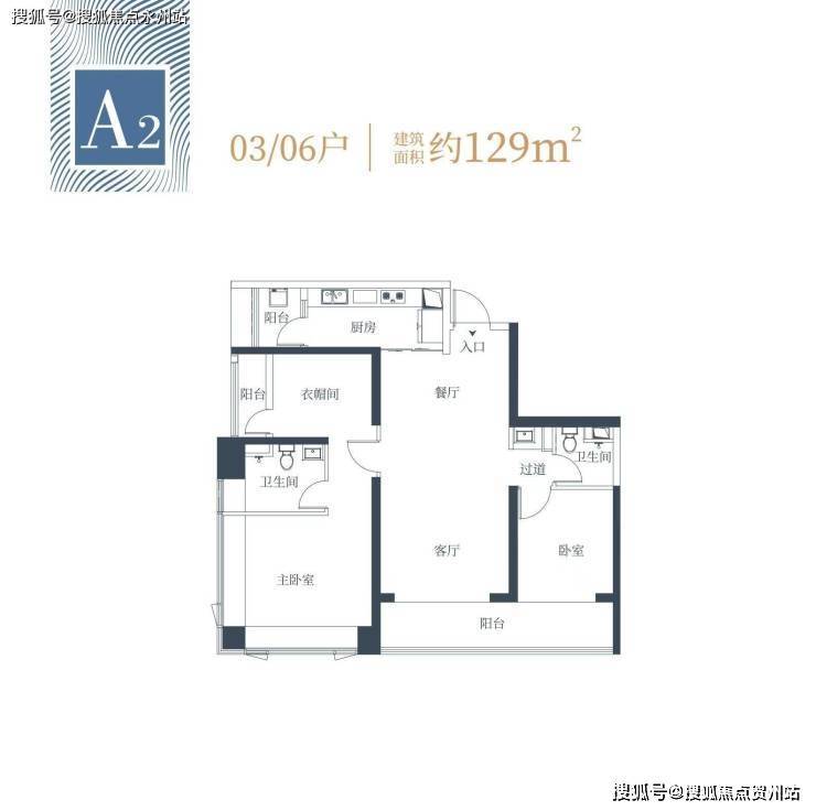 A2户型约129㎡2+1房两卫(1栋1/2单元03/06户型)竖厅格局,餐客一体设计,相比A1户型,阳台更大,连通次卧,其中公卫是暗卫,空气流通性差;需要靠封阳台获取+1房;东南朝向,看向小区内部和南开大厦。