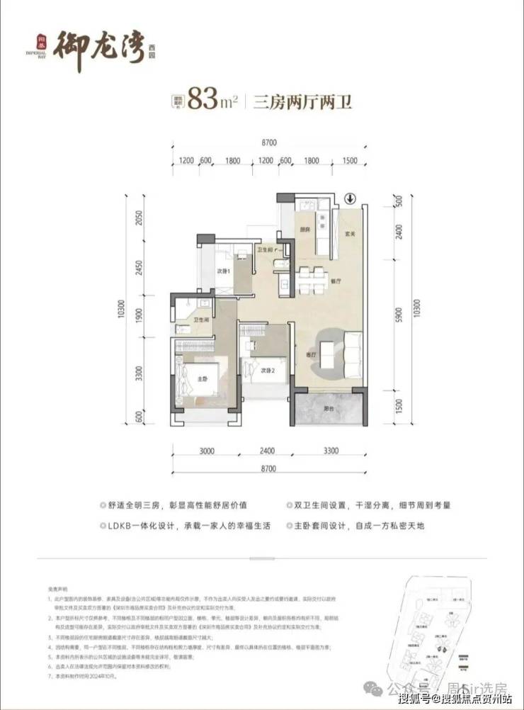 83㎡3房2卫,分布在2栋2单元03/04户型,设计的是竖厅格局,客厅开间3.3米,LDKB一体化设计,三开间朝南,U型厨房,公卫三段式分离设计,得房率约79.25%(不含赠送),东南或西南朝向,加上赠送得房率约89%。