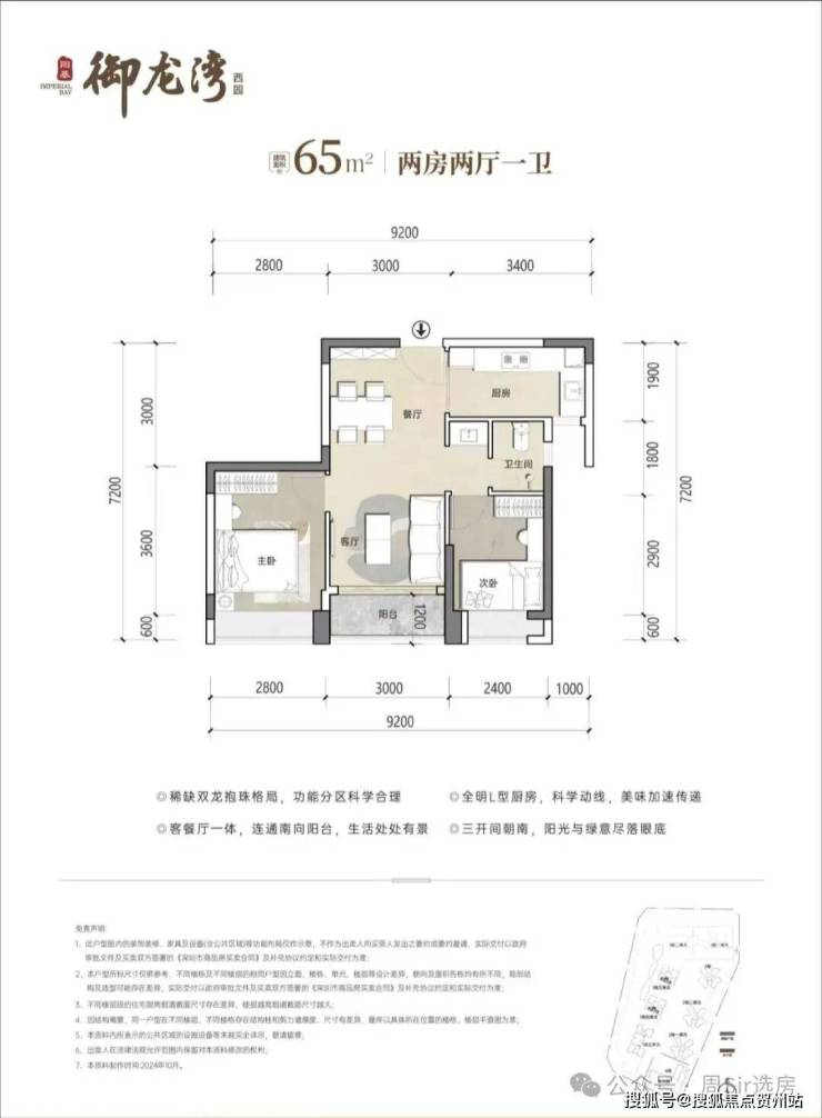 65㎡2房1卫,分布在1栋3/4单元04/05户型,设计的是竖厅稀缺的双龙抱珠格局,客厅开间3米,三开间朝南,L型厨房,卫生间分离设计,得房率约73.26%(不含赠送),西南朝向,加上赠送得房率约80%。