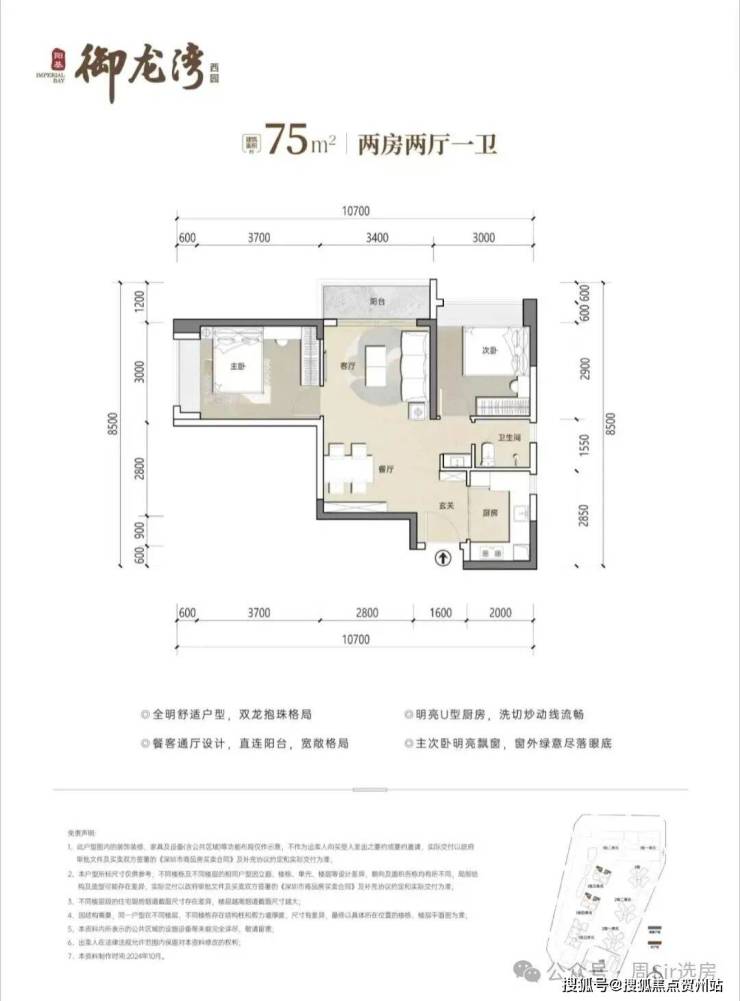 75㎡2房1卫,分布在1栋3/4单元03/06户型,设计的是竖厅稀缺的双龙抱珠格局,客厅开间3.4米,U型厨房,卫生间三段式分离设计,得房率约73.26%(不含赠送),东南或西北朝向,加上赠送得房率约80%。