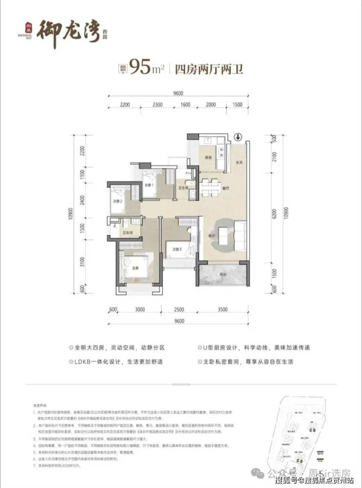 95㎡4房2卫,分布在2栋1单元06户型,设计的是竖厅南北通透格局,客厅开间3.5米,五开间朝南,U型厨房,公卫三段式分离设计,得房率约79.25%(不含赠送),阳台主朝东北向,加上赠送得房率约93%。