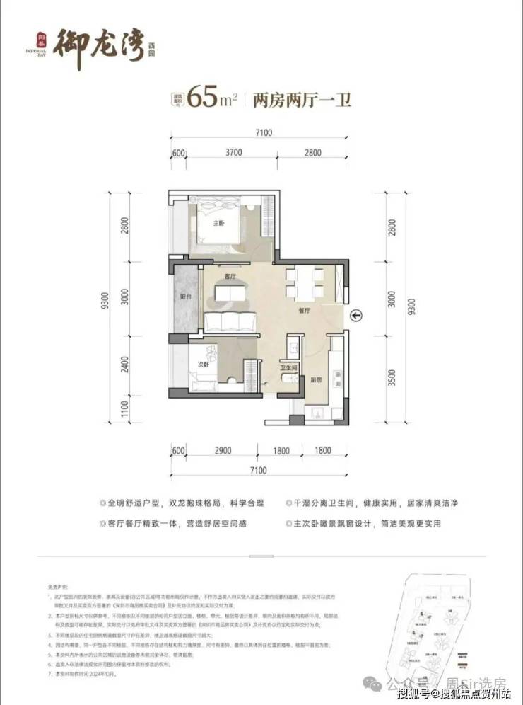 65㎡2房1卫,分布在1栋3/4单元02/07户型,设计的是竖厅稀缺的双龙抱珠格局,客厅开间3米,三开间朝南,L型厨房,卫生间分离设计,得房率约73.26%(不含赠送),东南或西北朝向,加上赠送得房率约79%。