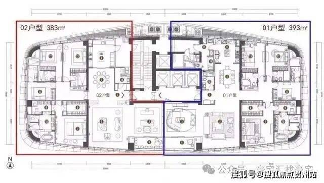 4梯2户布局,左边383㎡,右边393㎡