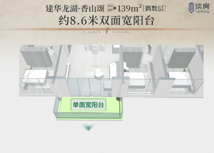 空中花园连接景观阳台,连成约8.6米超长南向双面宽。