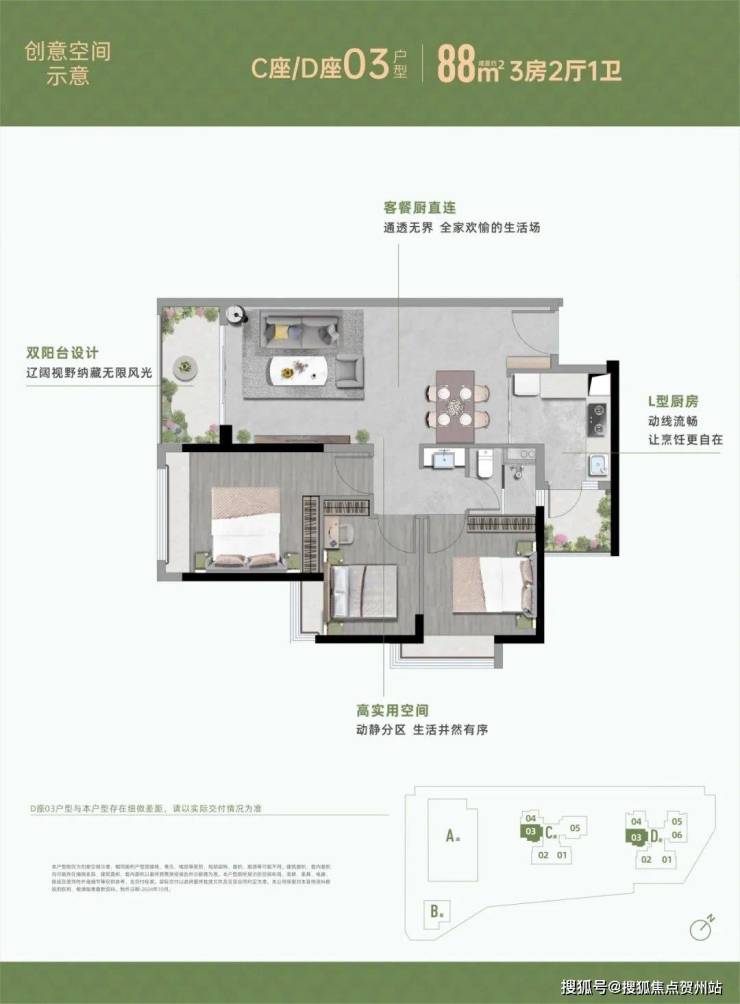 88㎡的3房2厅1卫,设计的是竖厅格局,客厅3.5米开间,LDKB一体化设计,3个卧室分别做到了主卧13.2㎡/次卧9.5㎡/次卧8.1㎡(包含墙体飘窗),L型厨房还带1个小生活阳台,卫生间三段式分离,得房率约80%(不含赠送),西南朝向。
