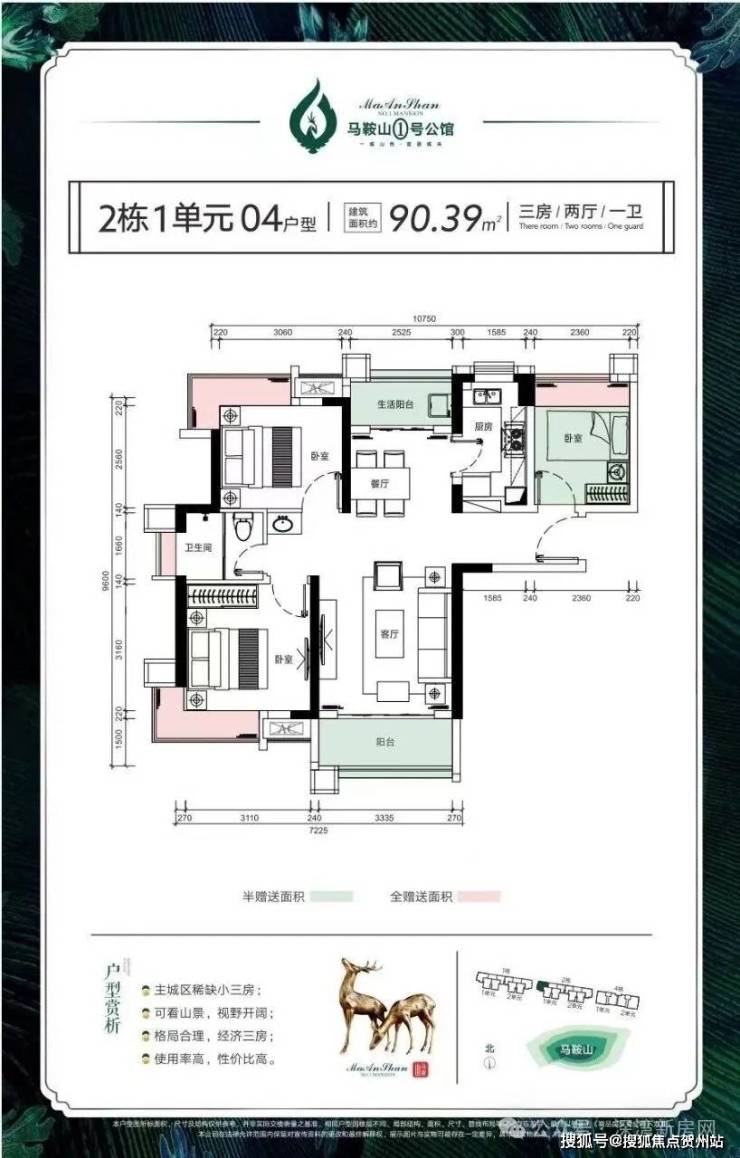 04户型:90.39平米 3*2*1 均价:23280 元 南北通透,双阳台