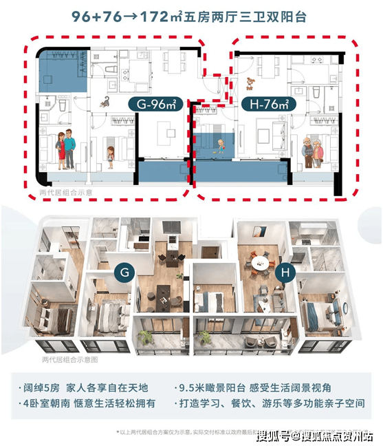 “一扇门里两套房”是人们对于“两代居”的最初印象。在格力海岸6期,格力地产精心打造了针对刚需,改善等不同置业需求的多种户型。业主可根据实际需求优化调整,灵活选用不同户型自由组合,54-114㎡的户型面积经过组合可提升至约130-180㎡,从而实现双客厅设计与双功能分区,满足多元化所需。与此同时,“两代居”产品让年轻人和老年人的生活空间既相对独立又紧密相连,为多代人创造愉快、安全而又轻松的居住环境,使幸福与舒适触手可及。