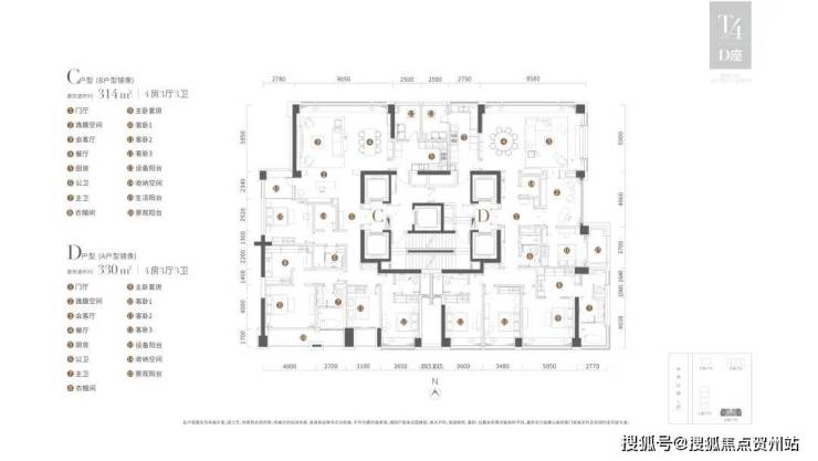 B/C户型:330m²四房三厅四卫,南北通透(卧室全南向)