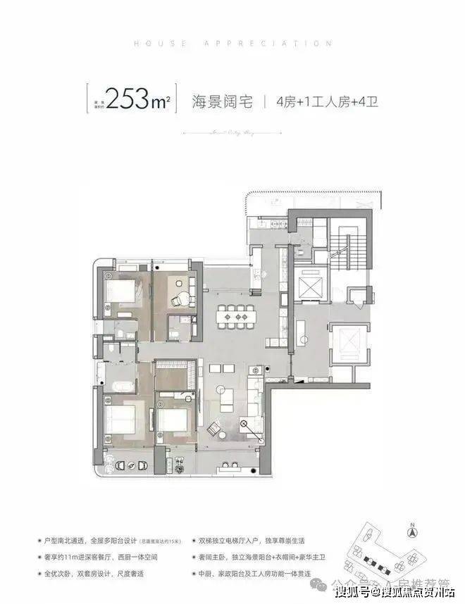 所有建面约250平以上的户型全都是南北通透的方正大户型,层高也都设置为约3.3-3.5米超大层高,绝对的豪宅打造,17层以上就可以看到比较明显的海景景观,2000-3000万以上的改善客户可以重点考虑。