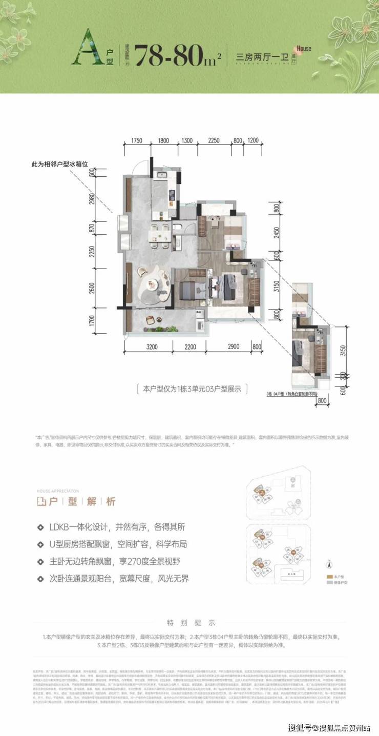 78-80㎡的3房2厅1卫,设计的是竖厅格局,客厅3.2米开间,LDKB一体化,S墙设计预留冰箱卡槽位,动静分区,主卧270无边转角飘窗,3个卧室分别做到了主卧16.62㎡/次卧9.27㎡/次卧5.72㎡(包含墙体飘窗),客厅连接次卧出5.4米长的大阳台,U型厨房,卫生间三段式分离,得房率约93-99%(包含赠送),西北朝向。