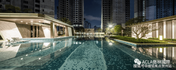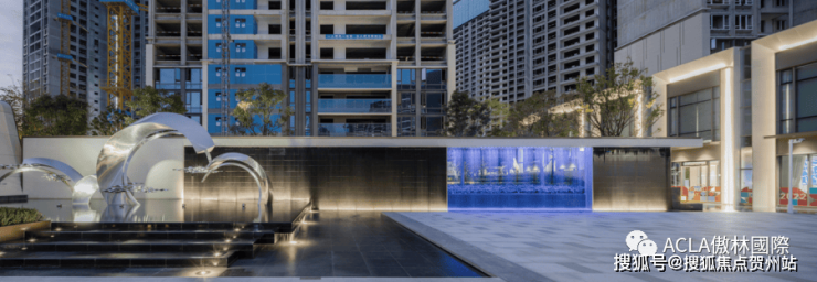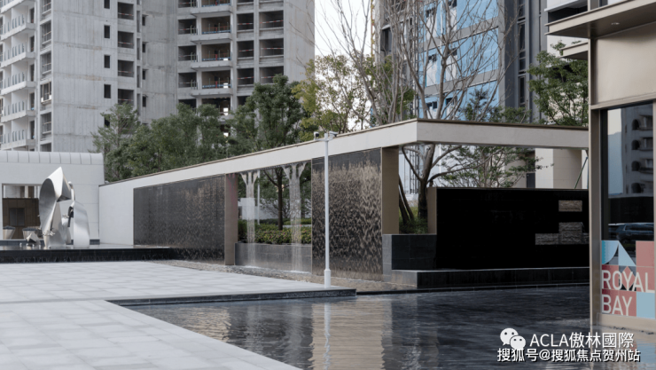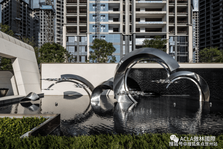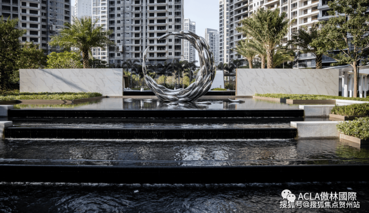 与泳池相连的跌水主水景,让访客用一望无际的视角来欣赏雕塑艺术品《乘风破浪》。