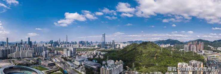 俯瞰银湖山、笔架山公园生态景观、拥福田、罗湖CBD城市中轴景观 。