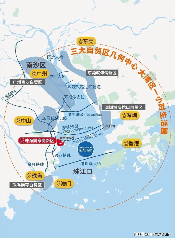 格力海岸所在的唐家湾,地理位置得天独厚,占定三大自贸区几何中心(深圳前海自贸区、广州南沙自贸区、珠海横琴自贸区)。且以大桥未支点效应,多维交通路网向外延展:港珠澳大桥、深中大桥(建设中,预计2024年通车)、金琴快线、兴业快线(建设中)、唐家港码头(计划开通到蛇口新航线)、广州地铁18号线延长线(规划中)...,未来将形成大湾区一小时生活圈,接轨世界前沿。