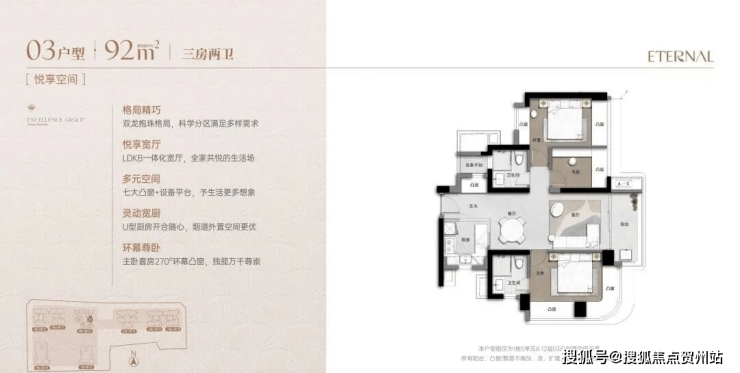 其中, 项目最小面积 92 ㎡产品, 做到了双龙抱珠的户型设计, 充分将户型内部空间进行展开, 优化